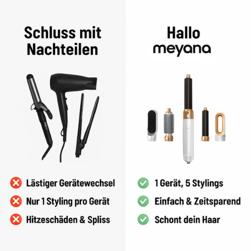 Der meyana Haarstyler ist eine innovative Lösung für schnelles, perfektes Styling. Mit 5 Aufsätzen bietet er maximale Flexibilität und ein Ergebnis wie vom Profi.