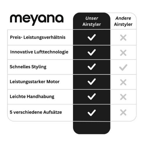 Der meyana Airstyler ist die smarte Alternative zu überteuerten Marken – mit allen Funktionen, die du fürs professionelle Styling brauchst. Leistungsstark, durchdacht und fair im Preis.